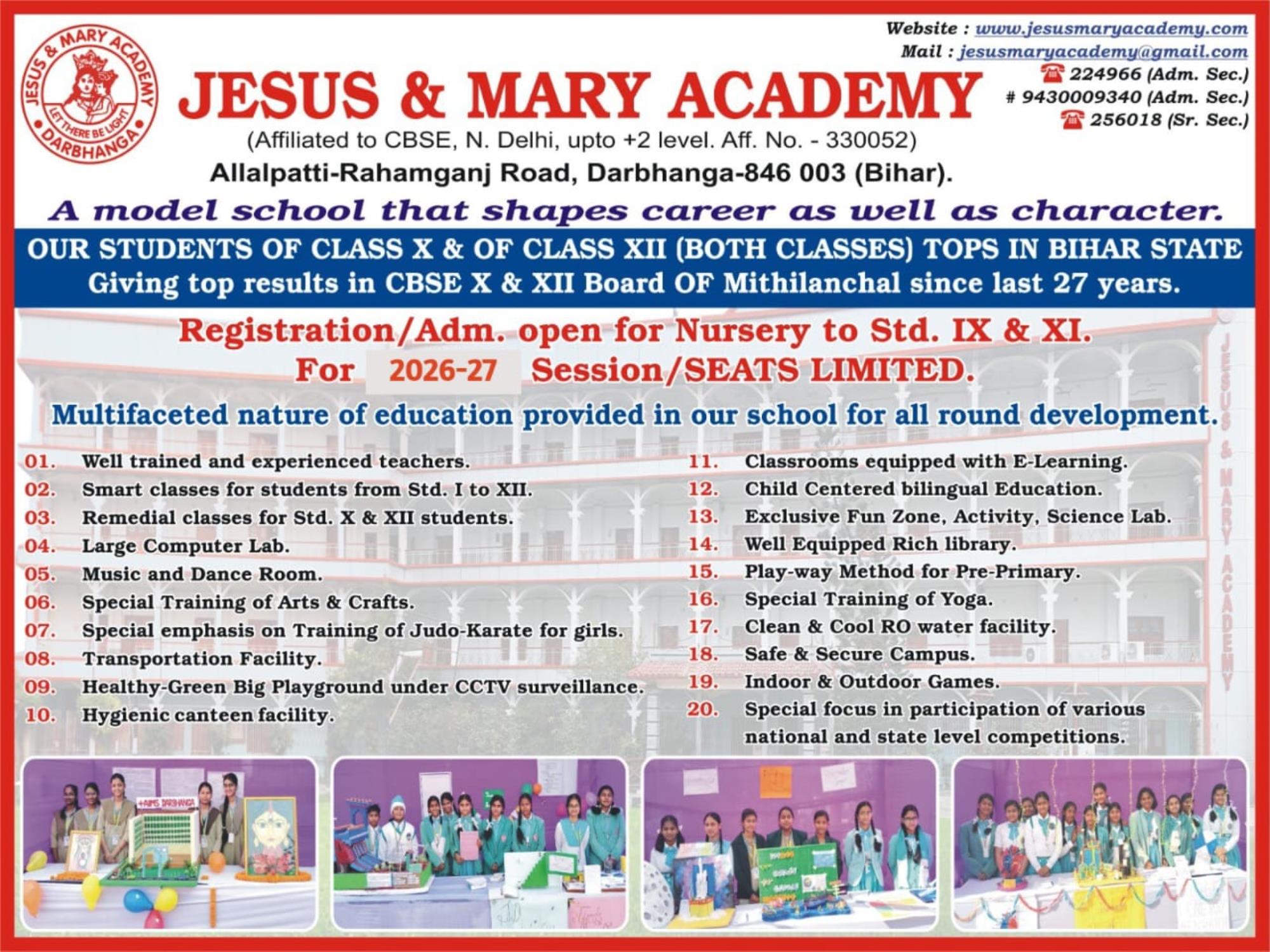 Jesus & Mary Academy which has a place of pride in the world of academics established its first branch at Darbhanga in Bihar in 1996, though the seeds were sown way back in 1993. This institution, sponsored by Govt. registered society (Under Societies Registration Act 21, 1860 Govt. of Bihar) has since been meeting the growing demands for a value based multipurpose English Medium Co-education institution.